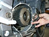 remettre la rondelle,chanfrin coté moteur,préparer la cloche en positionnement la couronne qui entraîne l'alternateur et la pompe a huile
